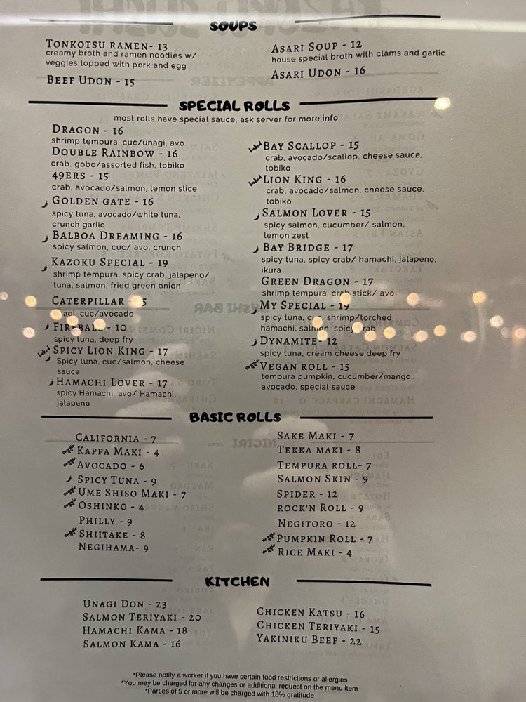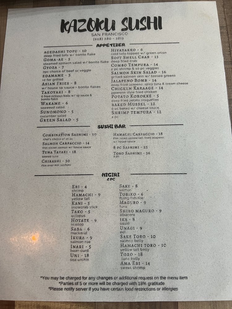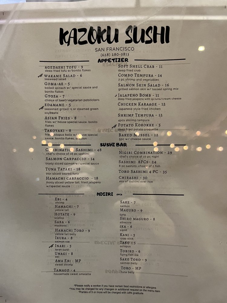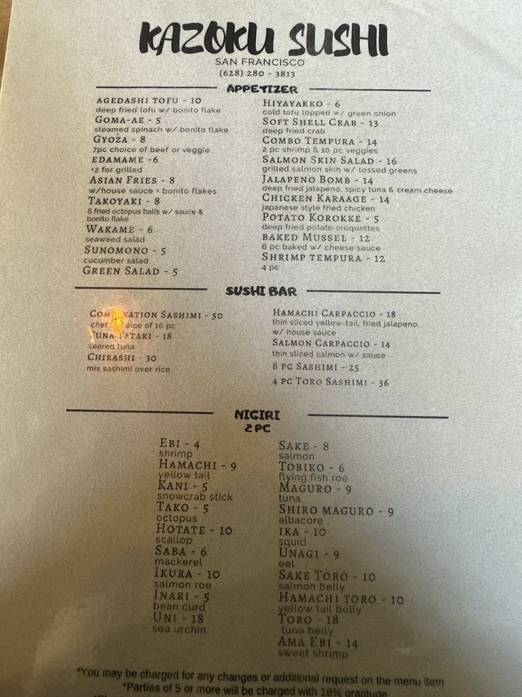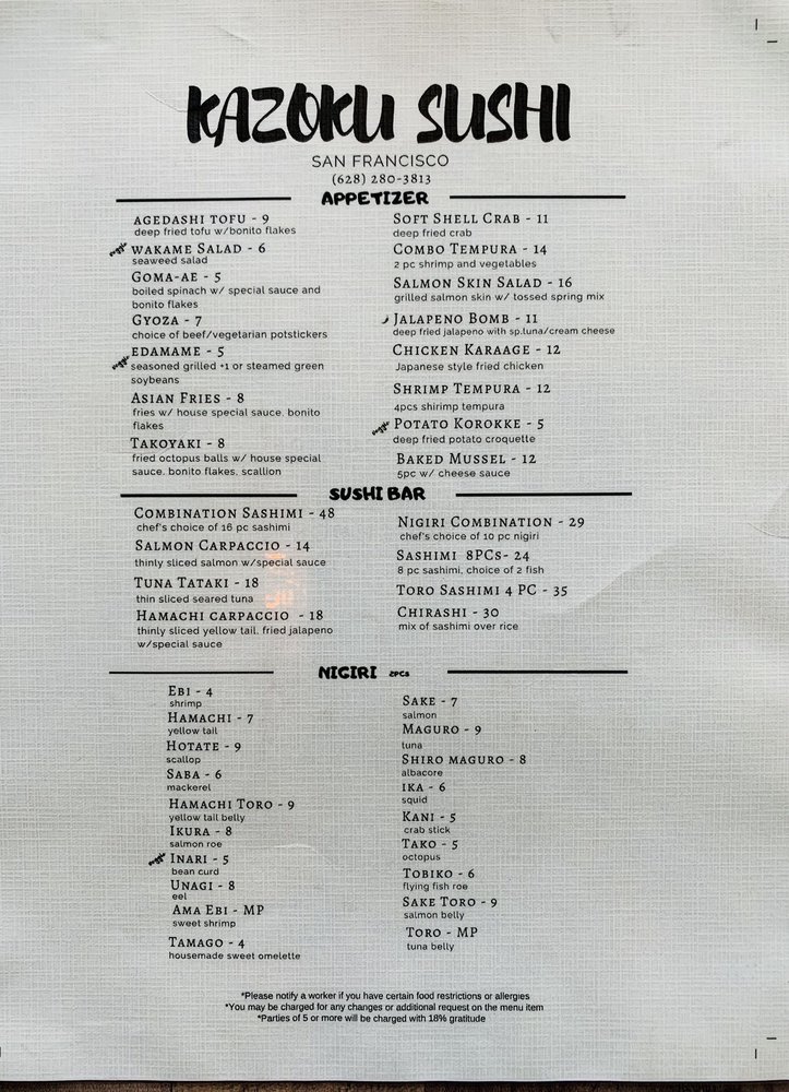 Kazoku Sushi San Francisco Menu (Update 2025)